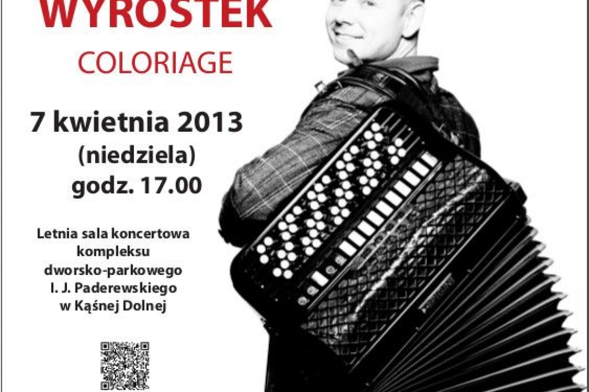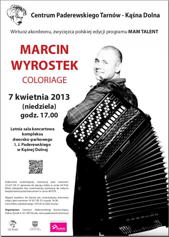 Zwycięzca polskiej edycji programu Mam Talent wystąpi w Centrum Paderewskiego Kąśna Dolna. Marcin Wyrostek ze swoim projektem Coloriage zagra 7 kwietnia 2013 roku.