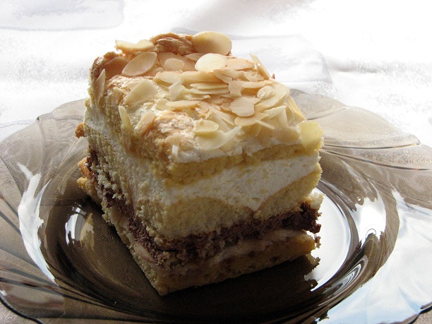 Śmietanę ubić z cukrem i kakao. Następnie dodać żelatynę rozpuszczoną w ciepłym mleku i dokładnie ubić. Wyłożyć na placek i układać biszkopty lekko wciskając.