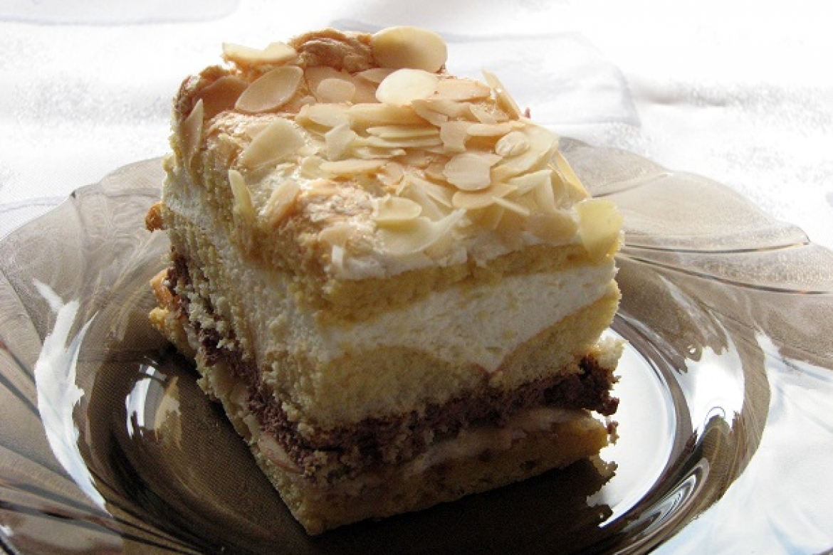 Margarynę utrzeć z cukrem pudrem i żółtkami na pulchną masę. Pod koniec dodać mąkę z proszkiem do pieczenia. Wymieszać. Ciasto upiec w dwóch foremkach. Na ciasto wyłożyć pianę i upiec.