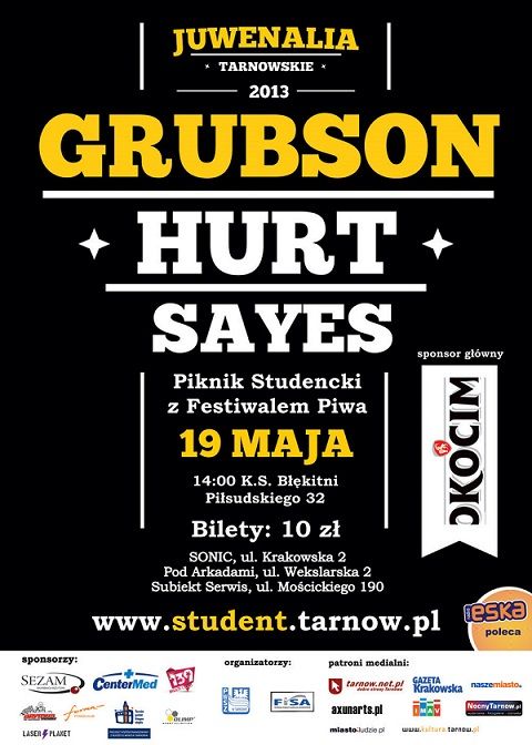 Finał Juwenaliów Tarnowskich 2013 odbędzie się w niedzielę, 19 maja, od godz. 14.00 na stadionie KS Błękitni przy ul. Piłsudskiego 32. Na studentów i mieszkańców miasta czekać będą liczne atrakcje piknikowe. Nie zabraknie potraw z grilla oraz ogródków piwnych. Uczestnicy imprezy będą mieli okazje do zdobycia nagród, w tym najcenniejszej: wycieczki dla dwóch osób w Alpy. Muzyczna część Juwenaliów Tarnowskich towarzysząca finałowi to występy lokalnych supportów oraz zespołu Sayes, półfinalistów programu Must Be The Music, grupy HURT z rockowymi brzmieniami oraz gwiazdy wieczoru - rapera Grubsona.