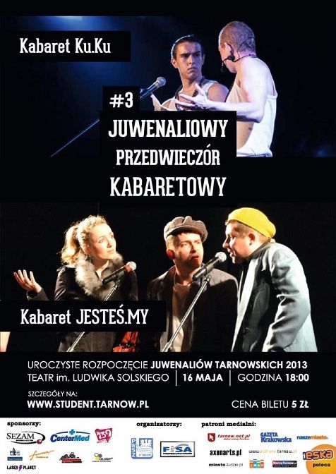 Początek Juwenaliów Tarnowskich 2013, to trzecia edycja Juwenaliowego Przedwieczoru Kabaretowego. W tym roku na Dużej scenie Teatru im. L. Solskiego zobaczymy kabaret Ku.Ku z Przemyśla i kabaret JESTEŚ.MY z Piotrkowa Trybunalskiego. Obydwie formacje to tegoroczni laureaci ósmego Przeglądu Kabaretów Studenckich "PiGi".