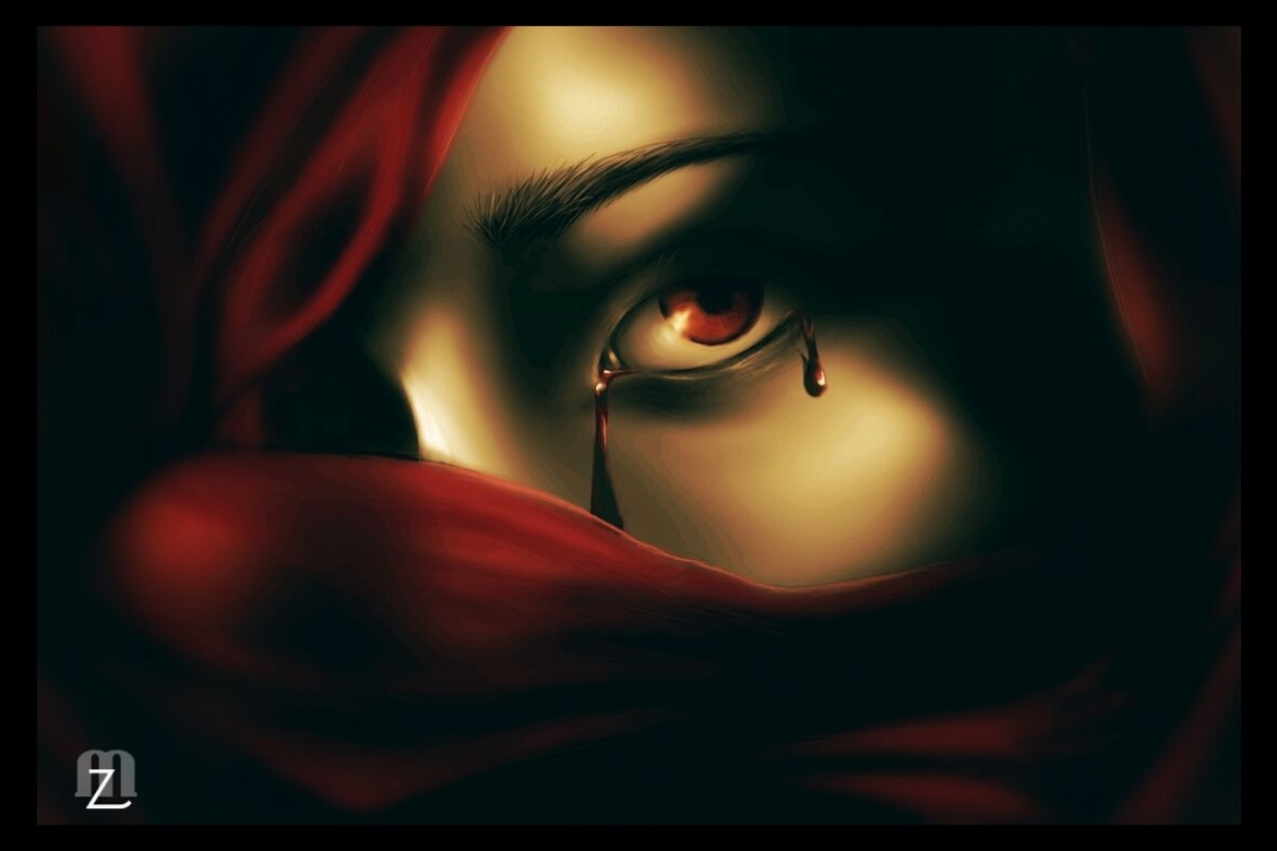 Spojrzenie ukazuje skrywany ból, pod osłoną być może jedwabnej chusty jesteśmy w stanie dostrzec tylko oko i jego kontur, pięknie zarysowaną czarną brew, ledwie zauważalne delikatne, kobiece rzęsy, nieskazitelną skórę i krew spływającą po policzku. Obraz jest pełen uczuć, skrywanych emocji, jak często dla świata nasze oczy są piękne, szkliste, radosne, pełen wesołych ogników, a tak naprawdę napełnione są łzami, bólem, niewyobrażalną samotnością?