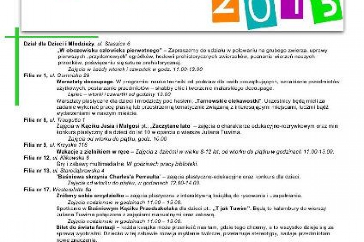 Wakacje z zielnikiem w ręce – Wycieczki w plener (najbliższą okolicę biblioteki) celem zbierania ziół i kwiatów, a następnie ich identyfikacja na podstawie dostępnej w bibliotece literatury. W dalszej kolejności suszenie roślin i ich przygotowanie do tworzenia kompozycji przestrzennych i płaskich. W dni deszczowe tworzenie biżuterii oraz zabawy plastyczne.