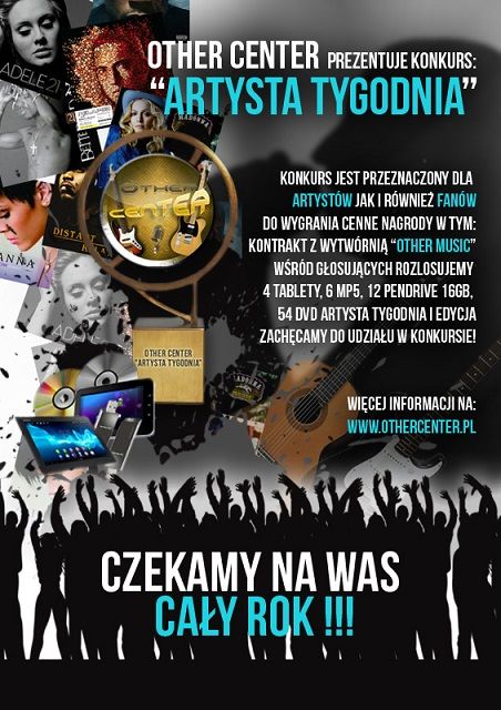 Witajcie! Z wielką przyjemnością ogłaszamy iż 1 czerwca 2013 Roku rusza druga edycja ogólnopolskiego konkursu muzycznego „Artysta Tygodnia”, którego organizatorem jest centrum informacyjno-muzyczne „Other Center”, działające w ramach platformy muzycznej „Other Space” z siedzibą w Skrzyszowie k. Tarnowa (woj. małopolskie).