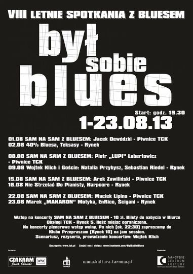 Już po raz ósmy Tarnowskie Centrum Kultury zaprasza na muzyczne sierpniowe piątki na tarnowskim Rynku, które już tradycyjnie odbędą się pod hasłem„Był sobie blues". W tym roku odbędą się 4 koncerty plenerowe oraz, co jest nowością, 4 koncerty klubowe pod wspólnym tytułem „Sam na sam z bluesem", na które zapraszamy przeddzień każdego koncertu rynkowego (czwartki) do Piwnic Tarnowskiego Centrum Kultury.
