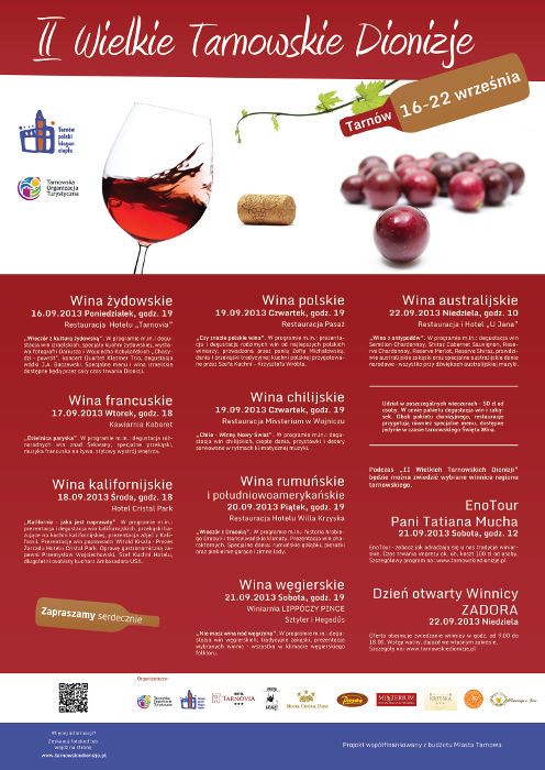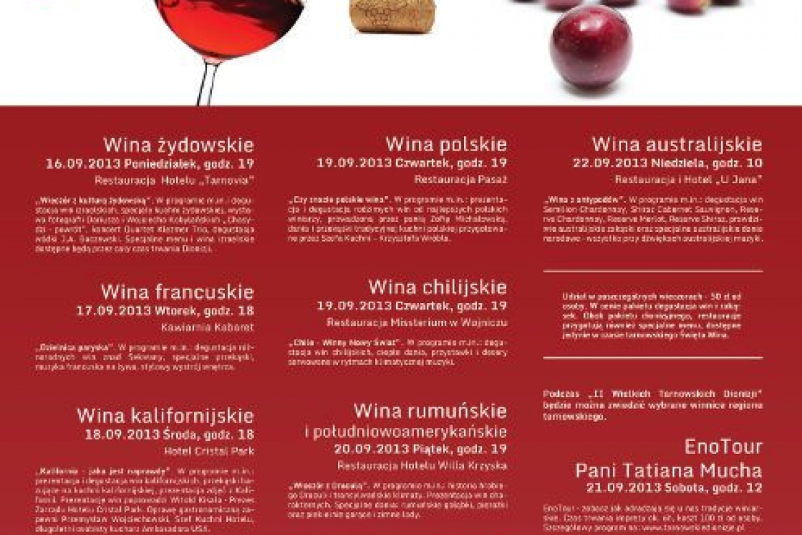 Już w najbliższy poniedziałek 16 września rozpoczynają się II Wielkie Tarnowskie Dionizje. Przez siedem dni w 8 restauracjach wszyscy miłośnicy dobrych win, dobrego jedzenia i dobrej zabawy będą mogli uczestniczyć w magicznych wieczorach i smakowych podróżach po całym globie.