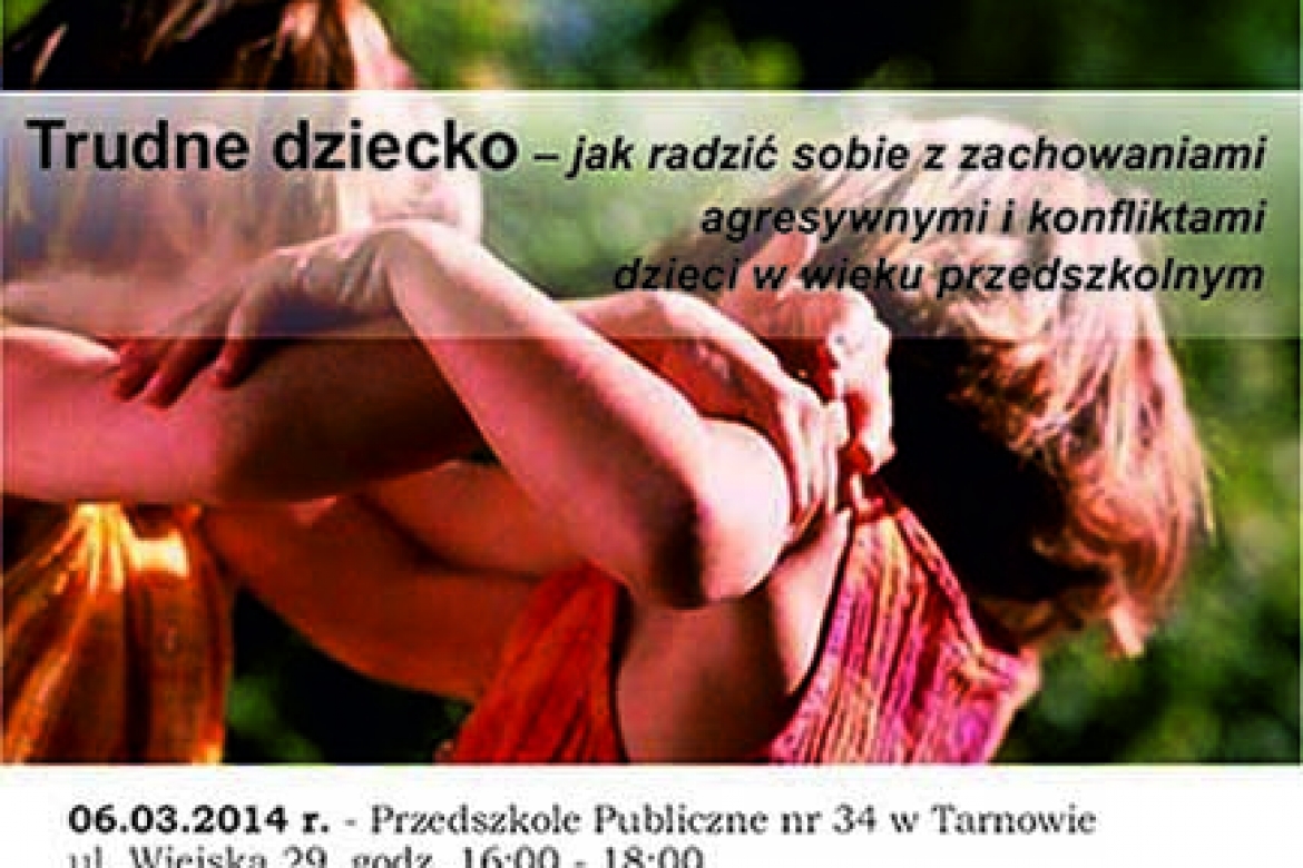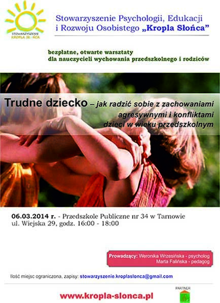 Z uwagi na narastającą skalę problemu agresji wśród dzieci Stowarzyszenie Psychologii, Edukacji i Rozwoju Osobistego “Kropla Słońca” organizuje warsztaty dedykowane dla nauczycieli wychowania przedszkolnego i wczesnoszkolnego oraz rodziców pt. Trudne dziecko – jak radzić sobie z zachowaniami agresywnymi i konfliktami dzieci, które odbędą się w Publicznym Przedszkolu nr 34 w Tarnowie (Partner akcji) 06.03.2014 w godz. 16:00-18:00. Ilość miejsc ograniczona, decyduje kolejność zgłoszeń (stowarzyszenie.kroplaslonca@gmail.com)