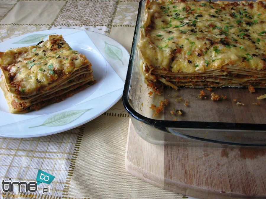 Naczynie żaroodporne wysmarować tłuszczem. Ułożyć w nim pojedynczą warstwę pasów z ciasta jeden obok drugiego przykrywając częścią sosu (najlepiej, aby jedna warstwa pasów była wzdłuż, a druga w poprzek formy). Tą czynność z przekładaniem ciasta i sosu powtarzać do skończenia składników. Wierzch lazani zakończyć sosem pomidorowym, posypując startym żółtym serem. Piec około 20-25 min, w 200oC.