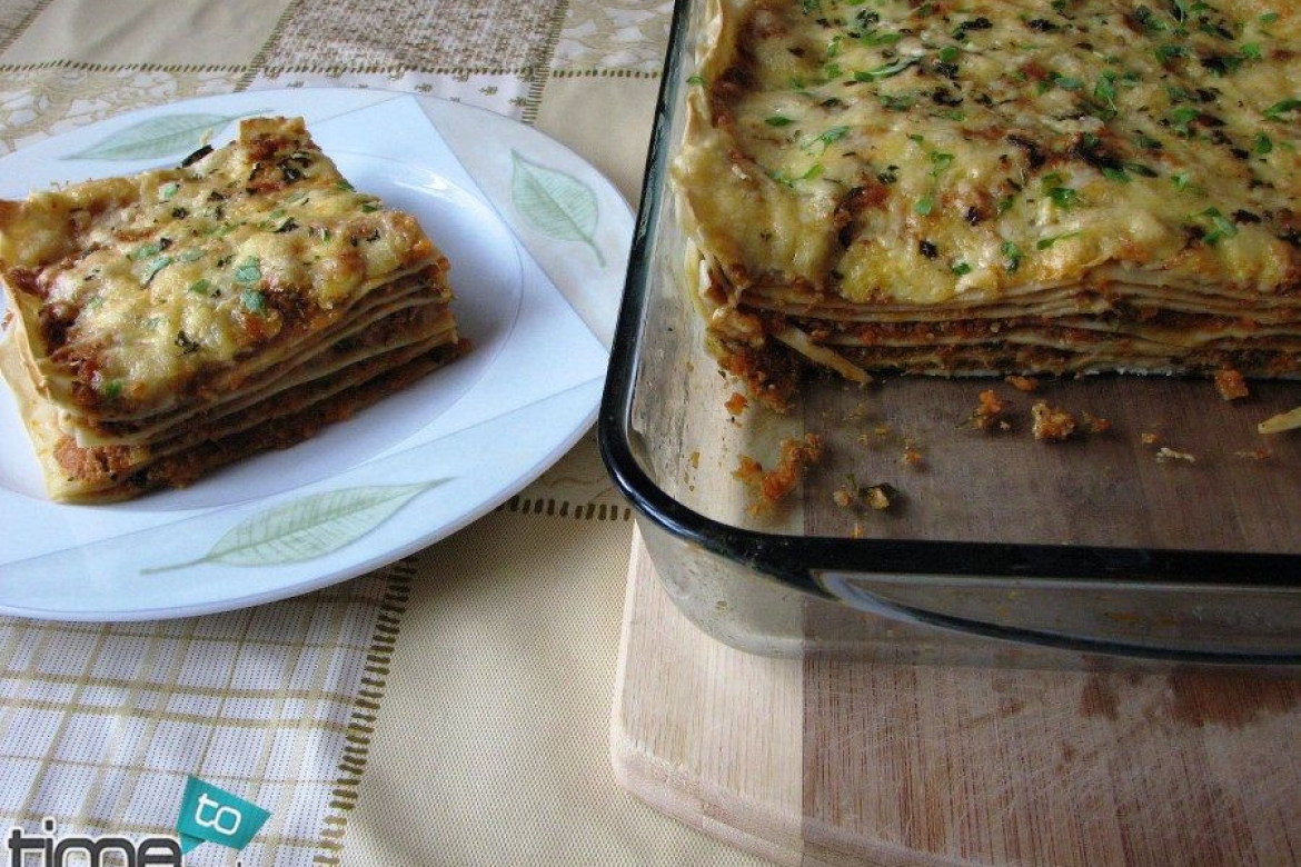 Na oleju usmażyć cebulę, następnie dodać do niej mięso i chwilę poddusić. Jarzynę zmielić, dodać do mięsa i podlać wodą lub rosołem. Następnie dodać 2 łyżki koncentratu pomidorowego, sól, pieprz, wegetę, 1 łyżeczkę przyprawy do lazani, 1 łyżeczkę goździków mielonych – doprawić według własnego smaku i całość gotować około pół godziny, aby sos zgęstniał. Można również przegęścić zawiesiną z wody i mąki.
