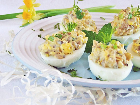 Wielkanoc to czas kiedy na naszych stołach królują jajka. Są one zarówno najpiękniejszą ozdobą naszego stołu, jak i znakomitą przekąską. Można podawać je w galarecie, w szynce, w sałatkach i faszerowane na wiele sposobów. Przygotowaliśmy dla Was kolekcję przepisów, w których każdy znajdzie coś dla siebie lub odkryje swoją ulubioną wersję tej klasycznej przystawki na świąteczne śniadanie.
