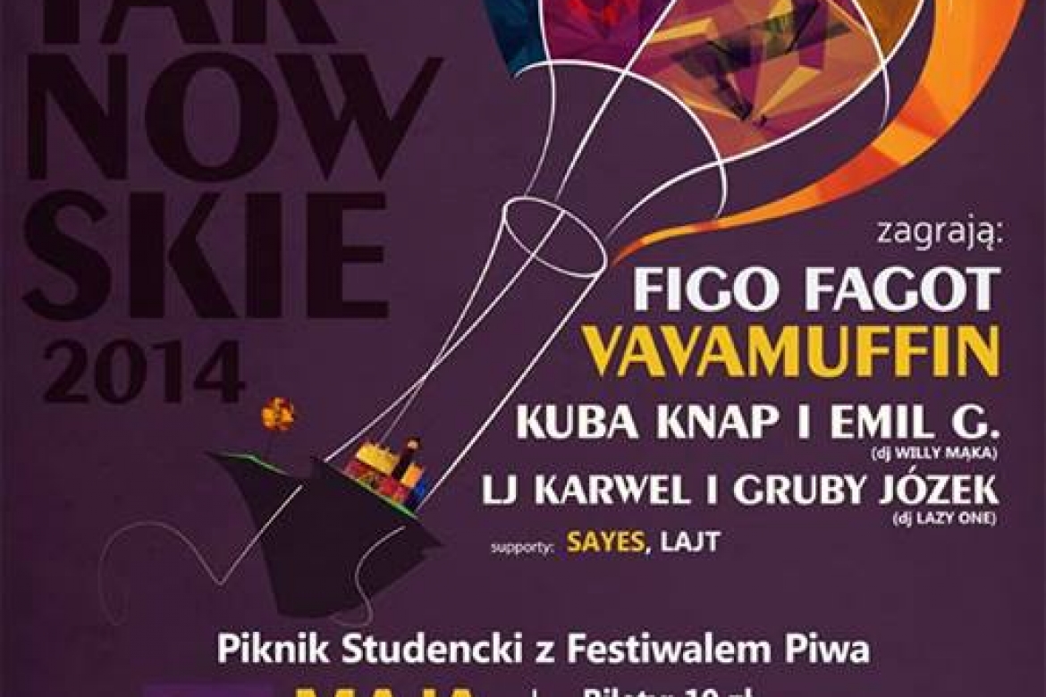 W niedzielę, 18 maja na stadionie KS „Błękitni” odbędzie się Piknik Studencki z festiwalem piwa. Od godz. 15.00 rozpocznie się muzyczna część Juwenaliów. Pierwsze w roli suportów na scenie zaprezentują się lokalne zespoły, a wśród nich m.in. Sayes, raper Lajt oraz zespół wyłoniony w Przeglądzie Muzycznym dla uczniów szkół ponadgimnazjalnych. O godz. 18.30 pierwsza z gwiazd wieczoru - Bracia Figo Fagot znani z grania prześmiewczej formy disco polo, a o godz. 20.00 Vavamuffin znany i intensywnie koncertujący zespół grający reggae oraz raggamuffin. Od ok. godz. 22.30 scenę opanują raperzy związani z wytwórnią Alkopoligami: Kuba Knap i Emil G. z Dj Willy Mąką oraz LJ Karwel i Gruby Józek z Dj Lazy One. To ich koncertem około północy zakończą się Juwenalia Tarnowskie.