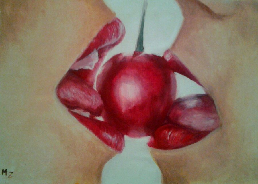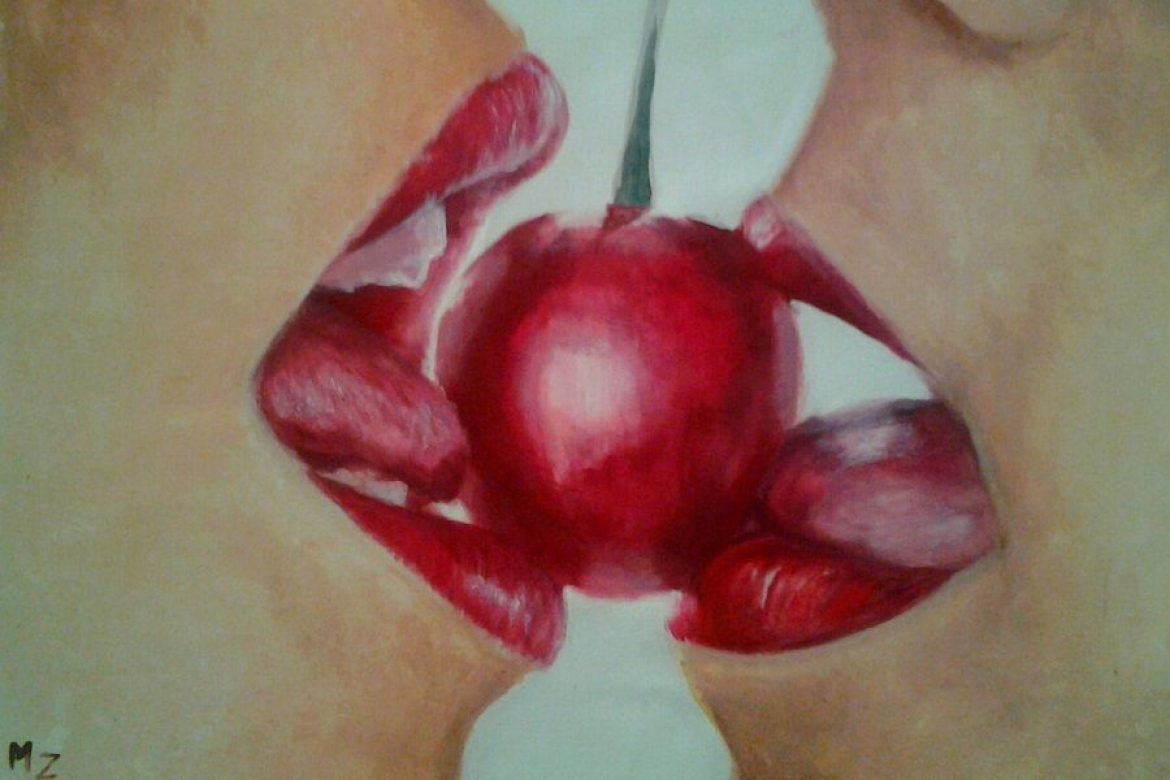 Na pierwszym planie bezsprzecznie znajdują się usta, które dzielą się wiśnią, która to jest symbolem miłości namiętnej. Namiętność od zawsze była tematem, o którym zbyt wiele się nie mówiło, a ten obraz podaje nam ją jakby na tacy. Intensywna czerwień, pełne usta, biel zębów, stykające się z soczystym owocem języki…