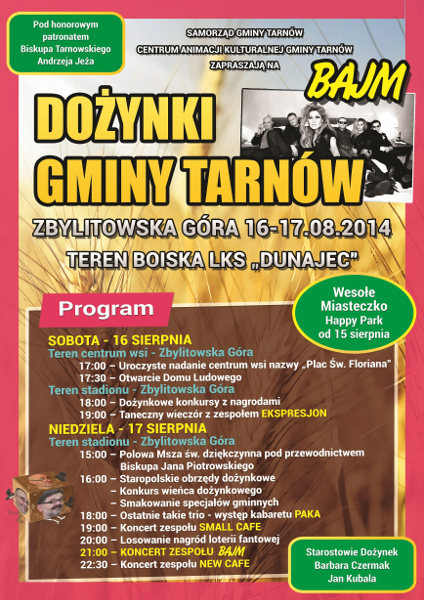 Jednak koncert jest tylko zwieńczeniem dwudniowego Święta Plonów w Gminie Tarnów. Organizatorzy zapraszają do Zbylitowskiej Góry już w sobotę, 16 sierpnia, kiedy to odbędzie się nadanie centrum wsi nazwy „Plac św. Floriana”, oraz otwarcie Domu Ludowego. Ten dzień będzie wyjątkowo ważny dla mieszkańców. Nie tylko centralny plac miejscowości zyska nazwę, którą zawdzięcza figurze św. Floriana, ale też otwarty zostanie okazały budynek wielofunkcyjny. Inicjatywa jego zbudowania pojawiła się już trzydzieści lat temu. Później budowy tej zaniechano, a dziś Zbylitowska Góra może w końcu cieszyć się z domu, w którym znajdzie się miejsce na przedszkole czy remizę OSP. Po uroczystościach w centrum wsi, na stadionie miejscowego Klubu Sportowego, czekają na mieszkańców konkursy z nagrodami czy taneczny wieczór z muzyką na żywo.