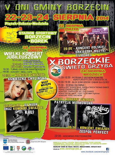 Nie mniej emocjonująco zapowiada się niedzielna (24 sierpnia) część Święta Grzyba. Wystąpią gwiazdy, które nie potrzebują szczególnej rekomendacji: wracająca po kilku latach do Borzęcina PARTYCJA MARKOWSKA oraz zespół PERFECT na czele z Grzegorzem Markowskim.