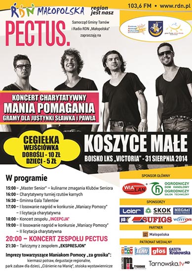 31 sierpnia w Koszycach Małych, w trakcie koncertu charytatywnego „Mania Pomagania” zagra zespół PECTUS. Koncert pierwotnie miał się odbyć 12 lipca, niestety z powodu opadów deszczu został przeniesiony właśnie na ostatni weekend sierpnia.