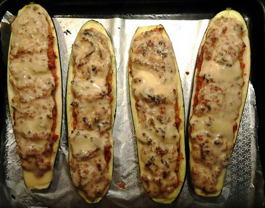 Bakłażany umyć, przekroić, wydrążyć środki, mięso mielone poddusić z pokrojoną drobno papryką, cebulą, pomidorami i miąszem z bakłażanów. Przyprawić tak by farsz był pikantny, aby smak był wyjątkowy dodać należy czosnek i zioła prowansalskie. Środki bakłażanów posmarować odrobiną oleju popieprzyć, nałożyć farsz, zapiekać około 30 min w piekarniuku, na minute przed końcem zapiekania poukładać plastry sera żółtego by tylko się rozpuścił.