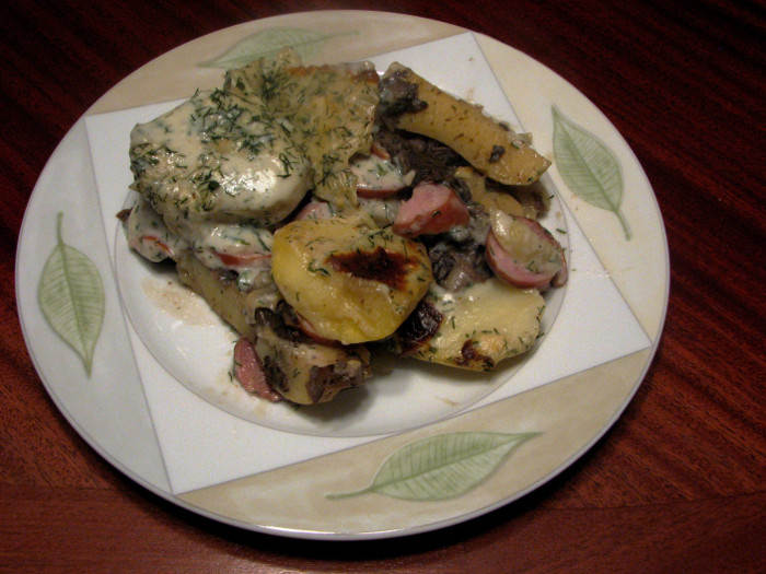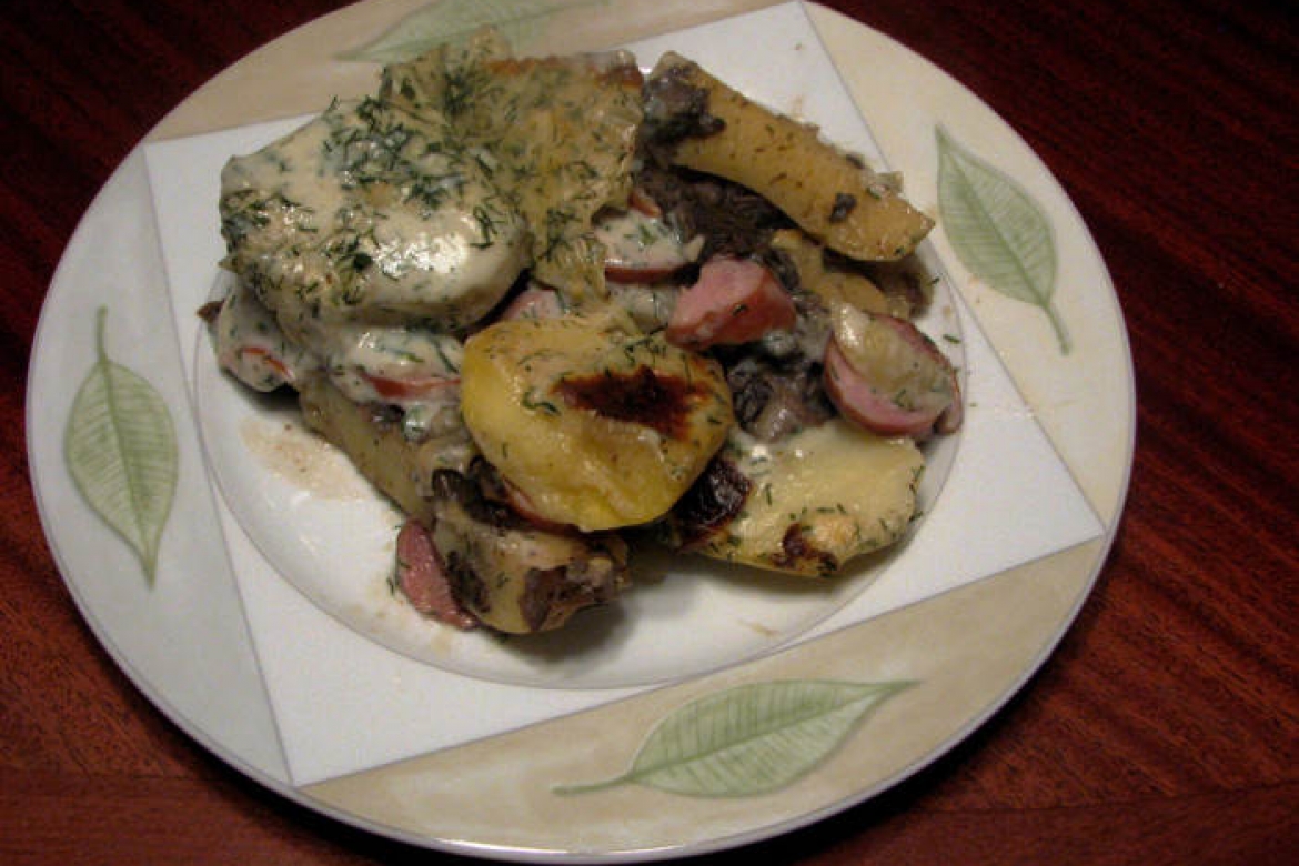 Na początku należy posmarować tłuszczem naczynie żaroodporne. Następnie układamy warstwami poszczególne składniki. Pierwszą warstwę tworzą ugotowane wcześniej i ostudzone ziemniaki, pokrojone w grube plastry. Ziemniaki można posypać odpowiednią przyprawą do ziemniaków. Następnie układamy osobno podsmażone pieczarki, cebulę i kiełbasę, oraz kolejną końcową warstwę ziemniaków. Wykończeniem jest sos beszamelowy z koperkiem. Ilość składników w zależności od wielkości naczynia, oraz zgodnie z własnym upodobaniem.
