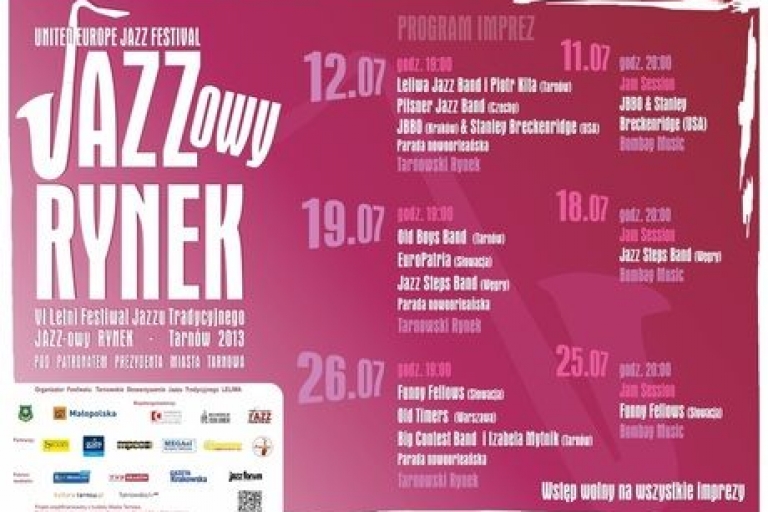 W lipcowe piątki tarnowski Rynek już po raz szósty rozkołyszą dźwięki jazzu tradycyjnego. Wzorem lat ubiegłych Tarnowskie Towarzystwo Jazzu Tradycyjnego „Leliwa” organizuje VI Letni Festiwal Jazzu Tradycyjnego „Jazz-owy Rynek”. To cykl koncertów plenerowych z udziałem wyjątkowych gości z różnych zakątków Europy. Koncerty plenerowe: Tarnowski Rynek I 12, 19, 26 lipca 2013 r...